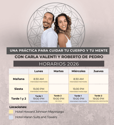 Grupo Siesta: Lunes y Miércoles 15:00 pm en Hotel Mayorazgo, Intensidad media - baja.
