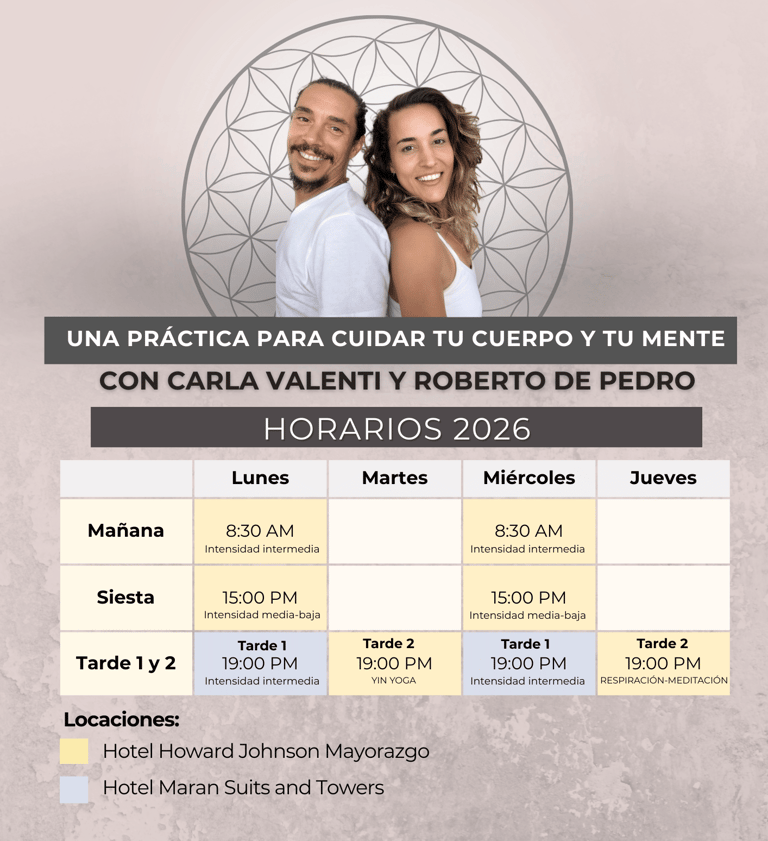 Grupo Tarde Mayorazgo: Martes y Jueves 19:00 pm en Hotel Mayorazgo. Los martes son de Yin Yoga y los Jueves de Meditación y Respiración.