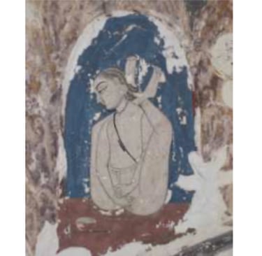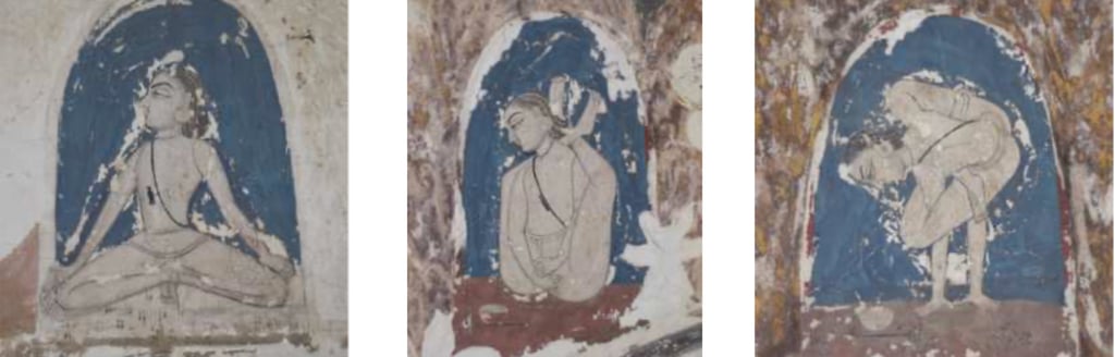 Pinturas murales del Mahāmandir con la misma Kpología de un yogui Nāth representado en tres āsanas diferentes. Fotograda de Jacqueline Hargreaves, 2009.