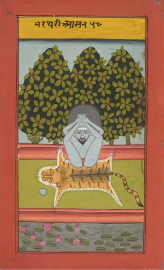 Bharatharī āsana (n.º 58) de la Jogapradīpyakā ilustrada, Add MS 24099, f. 60. © BriKsh Library Board.